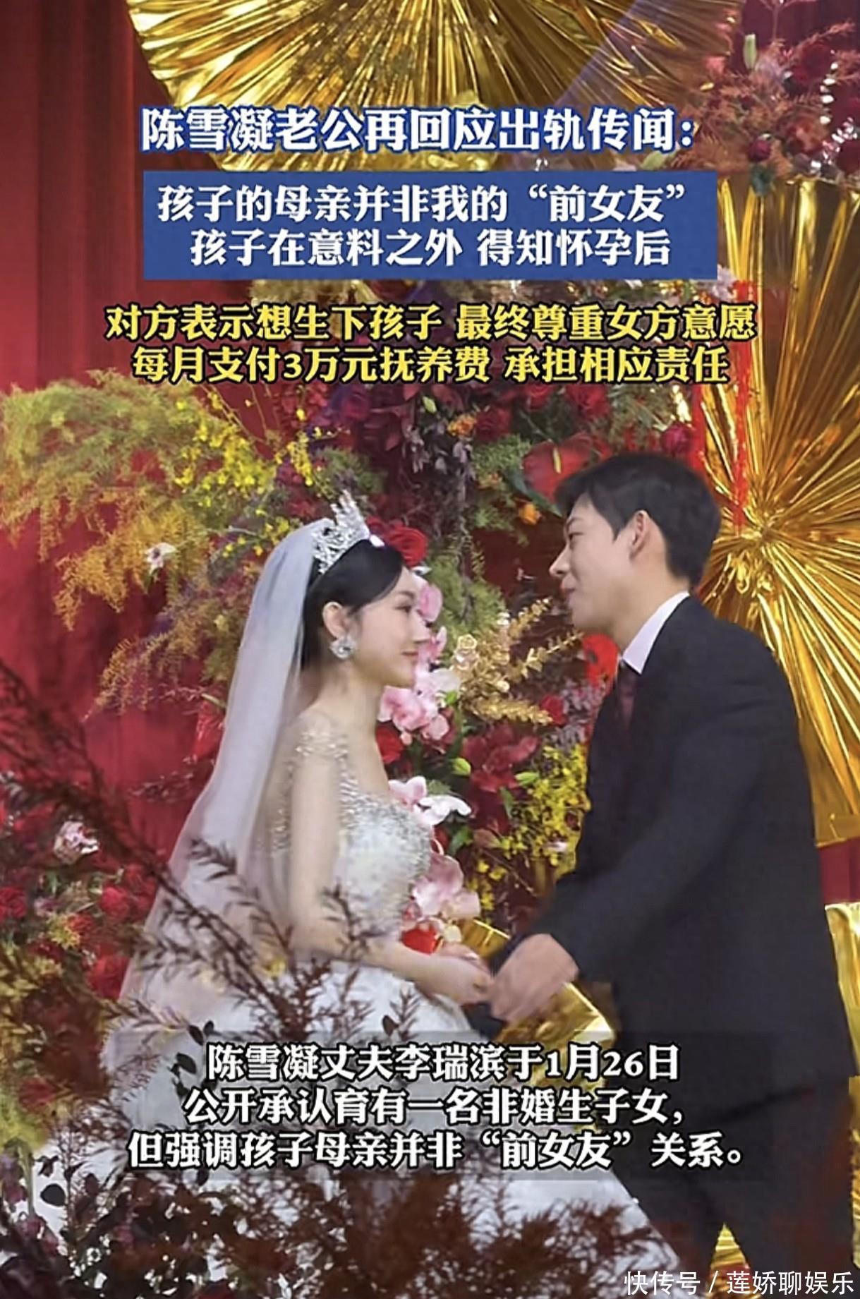 看到没?这种“双标”的操作,瞬间让他的“好父亲”人设崩塌。大家这才明白,这3万块不是给孩子的,是给吃瓜群众看的,是为了保住他“富二代”的面子,也是为了安抚现在的妻子陈雪凝。时间管理大师?闪婚背后的疑云再来看看时间线,这瓜更甜了。据网友推测,这个孩子的孕育期大概在2024年中到2025年初。而李瑞滨和陈雪凝是2025年8月才相识的。从时间上看,似乎确实不冲突。但问题在于那个所谓的“妥善结束”。如果孩子是2025年初生的,那李瑞滨在同年追求陈雪凝的时候,难道不应该坦白这个“意外”吗?更离谱的是,有爆料称,在李瑞滨和陈雪凝热恋期间(2025年底),他还被拍到和前女友拍了中式婚纱照。这操作,简直是把“时间管理”玩到了极致。半年内牵扯多位女性,从完颜嘉怡到前女友麦克丝,再到现在的陈雪凝,这剧情,编剧都不敢这么编。沉默的女主:比《绿色》更虐的现实在这场闹剧中,最让人心疼的,还是当事人陈雪凝。从婚礼上改编《绿色》告白,到直播里坚定地说“我选的人我相信”,再到如今面对丈夫的“私生子”丑闻,她选择了关闭评论区,发了一张和丈夫看演唱会的合照,配文“一切都好”。这种沉默,是无奈,是隐忍,还是被逼无奈的配合演出?作为公众人物,她嫁给了爱情,却不得不面对丈夫复杂的过去。那句“爱我的话你都说,爱我的事你不做”,如今听来,竟像是对她婚姻现状的绝妙讽刺。这起事件,从P图乌龙到承认私生子,再到3万抚养费的罗生门,已经不仅仅是一场娱乐八卦了。它像一面镜子,照出了现代婚恋观里最残酷的一面:在闪婚的冲动下,有多少人是在用现在的幸福,为对方过去的“烂摊子”买单?李瑞滨用一份看似完美的声明,试图用金钱和文字游戏来平息风波。但破碎的信任,真的能用3万块一个月买回来吗?陈雪凝的这场婚姻大戏,恐怕才刚刚开始。我们作为吃瓜群众,也只能叹一句:娱乐圈的水,真深。