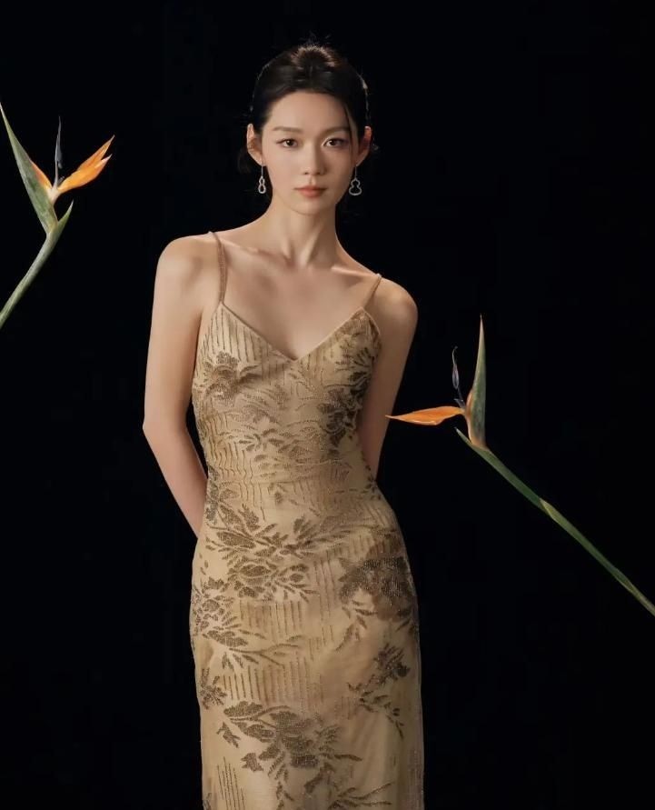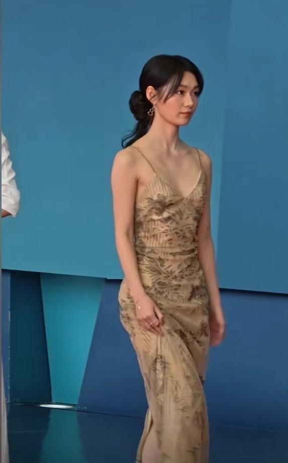 她选择了一条杏色底调的印花吊带长裙,裙面图案远观宛如一幅淡雅水墨画,既不喧宾夺主,又凸显文艺气息,低调中透着高级感。