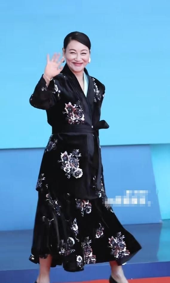 不同于前者的大胆露肤,惠英红选择了极为保守的黑色连体大衣,通体布满繁复刺绣与印花图案,腰间系一条宽幅腰带勾勒身形,踩着高跟鞋缓缓走来,举手投足间尽显影后风范。