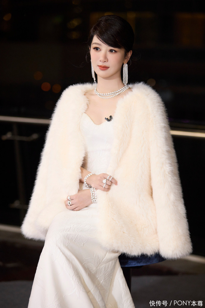 配饰方面,她选择了叠搭珍珠项链,圆润的珍珠串联在一起,温柔又典雅,与皮草的贵气相得益彰;手腕上的手链与戒指相互映衬,细节之处尽显精致,让整体造型更加完整,美得超凡脱俗。