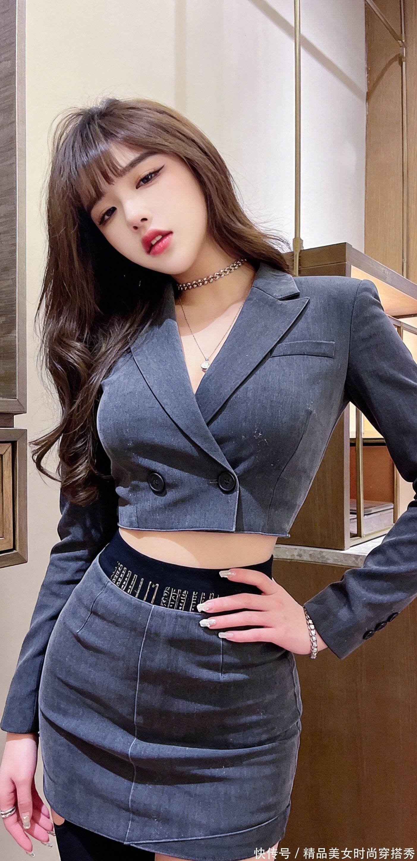 头发随意卷成大波浪,垂在肩前,挡住半只眼睛,抬眼时的慵懒,比任何香水都管用;项链在锁骨间晃,戒指在指尖转,每一个小动作都在说:「我在等你,敢不敢来?」